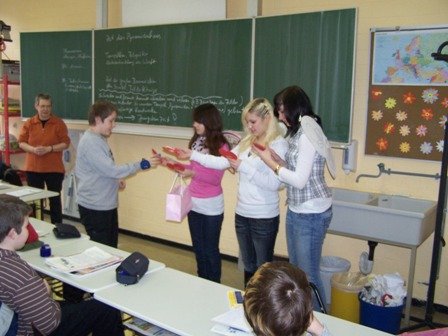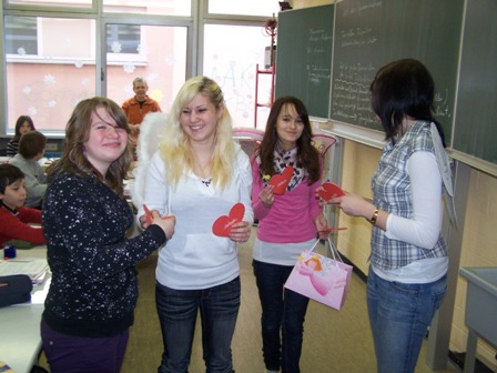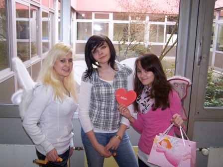 Die drei Engel der SV, Andrea, Kim und Désirée gingen am Freitag durch die Klassenzimmer und verteilten die Valentinstagsherzen.